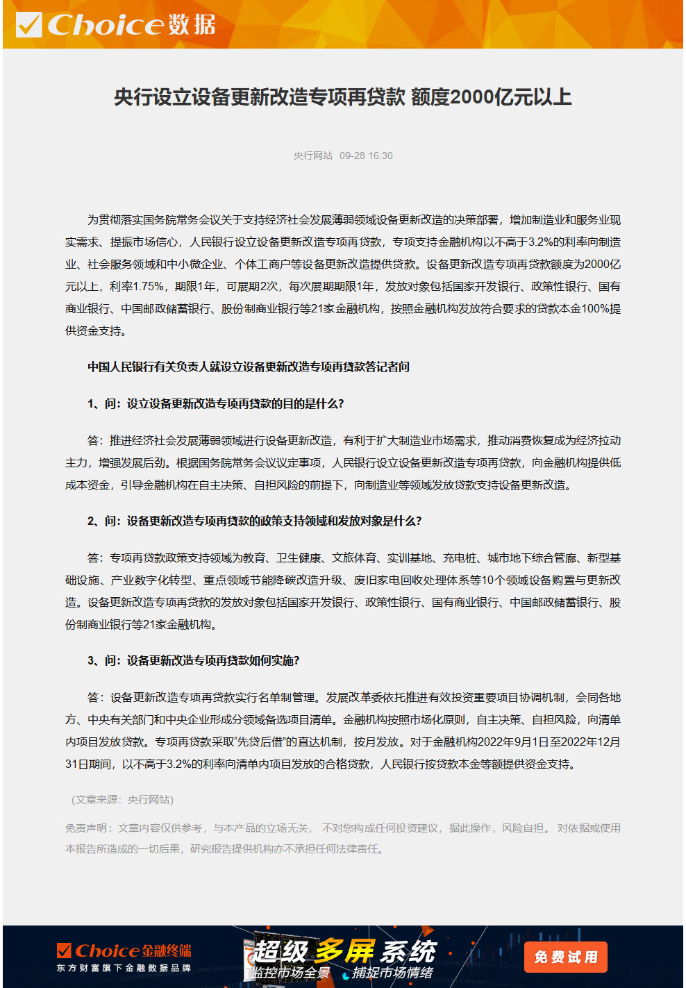 9月28日,根據中國人民銀行網站信息,為貫徹落實國務院常務會議關于支持經濟社會發展薄弱領域設備更新改造的決策部署,增加制造業和服務業現實需求、提振市場信心,人民銀行設立設備更新改造專項再貸款,專項支持金融機構以不高于3.2%的利率向制造業、社會服務領域和中小微企業、個體工商戶等設備更新改造提供貸款。設備更新改造專項再貸款額度為2000億元以上,利率1.75%,期限1年,可展期2次,每次展期期限1年,發放對象包括國家開發銀行、政策性銀行、國有商業銀行、中國郵政儲蓄銀行、股份制商業銀行等21家金融機構,按照金融機構發放符合要求的貸款本金100%提供資金支持。