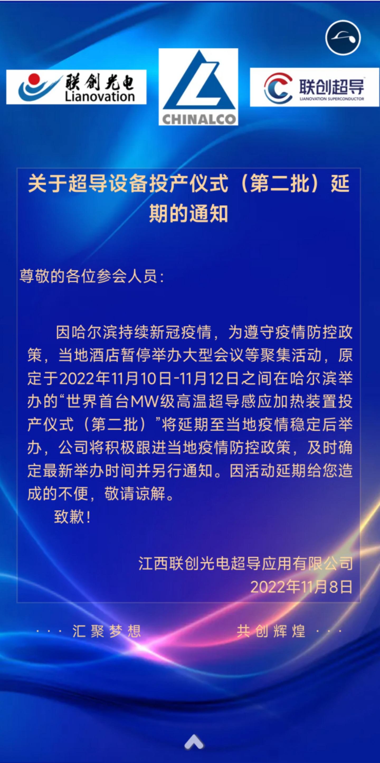關于超導設備投產儀式(第二批)延 期的通知