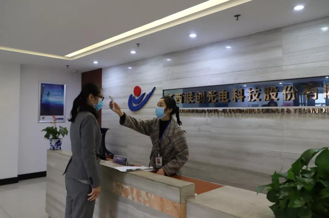 聯創光電科技園區實施封閉式管理,人員及車輛需憑核發的出入證進出園區。園區東門崗和南門崗分別設立體溫檢測點,對所有人員進行實名制身份證查驗、體溫測量和信息登記,堅決杜絕體溫異常人員進入園區和生產、公共辦公場所。