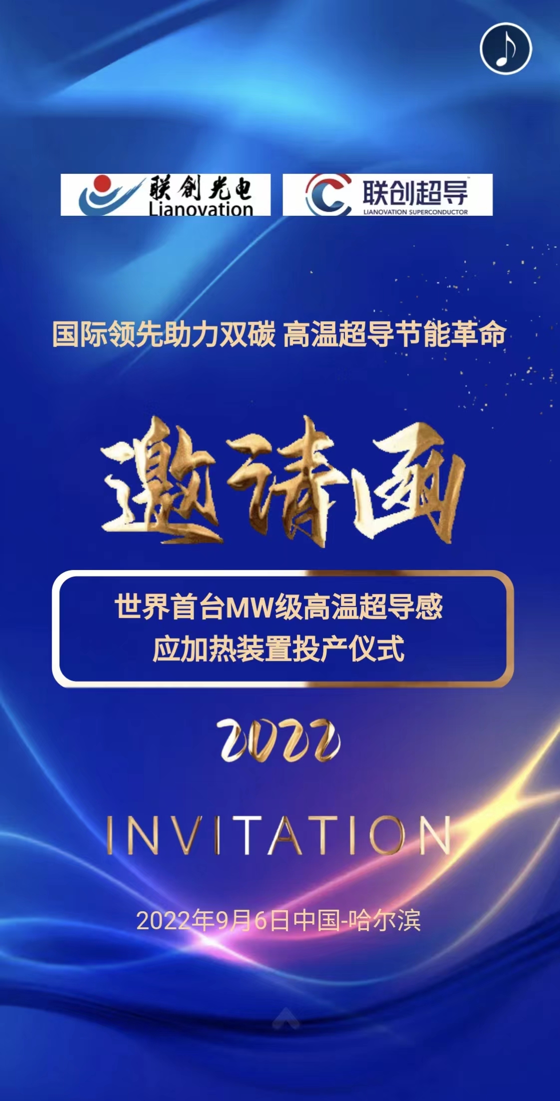 十年磨一劍,一朝試鋒芒!聯創高溫超導歷經近十年的科技長投,傾心打造的高溫超導感應加熱設備,超導設備于今年3月完成驗收,聯創高溫超導即將開啟商用的新征程。我們在求真創新、產業報國的道路上,離不開諸位的鼎力協助,為感謝諸位對聯創超導的信任與支持,公司將于2022年9月6日在哈爾濱舉辦“MW級高溫超導感應加熱裝置投產儀式”。屆時特邀嘉賓、行業專家、公司高管將介紹設備作業情況及公司高溫超導設備的發展戰略,這將是高溫超導近期最受矚目的重要盛會。為此,我們誠摯邀請您來參與我們的盛會!