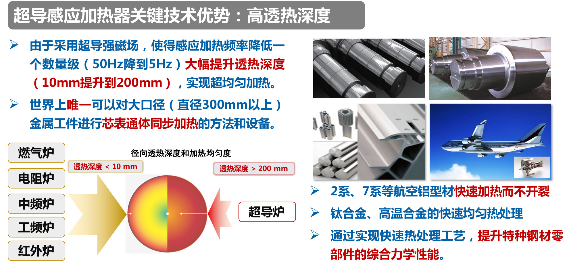 高溫超導感應加熱技術是金屬熱處理領域的變革性技術創新,是金屬熱加工,熱處理領域的一個顛覆性產品。它有望將傳統工頻感應爐的能效轉化率再提升一倍,即碳排放再減一半。另外,傳統工頻爐照比燃燒爐,并沒有解決透熱深度差的問題。工頻感應爐的透熱深度只有7mm。