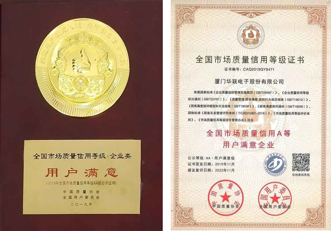 近日,中國質(zhì)量協(xié)會、全國用戶委員會在珠海聯(lián)合舉辦“2019滿意中國年會”,會上發(fā)布2019年全國市場質(zhì)量信用A等用戶滿意企業(yè)名單。名單依據(jù)《企業(yè)質(zhì)量誠信管理實施規(guī)范(GB/T29467)》、《企業(yè)質(zhì)量信用等級劃分通則(GB/T23791)》等多項國家標(biāo)準(zhǔn)選評,廈門華聯(lián)電子股份有限公司成功入選,公示等級為AA級。這已是華聯(lián)電子第四次獲得本項殊榮。