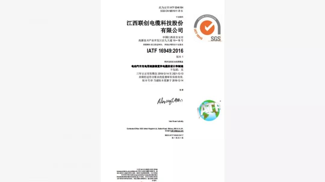 據了解,為開拓汽車行業市場,提升企業管理水平,聯創科技纜自2017年開始啟動IATF16949質量管理體系的建設工作,并于2018年12月14日正式獲得SGS頒發的IATF16949:2016質量管理體系認證證書。認證范圍為:電動汽車充電用連接裝置和電纜的設計和制造。